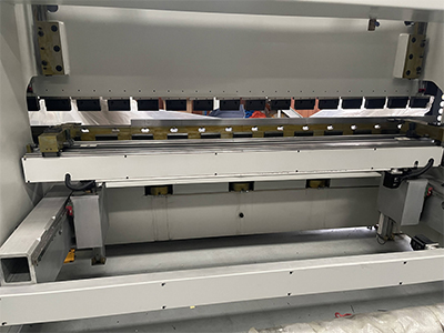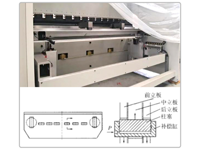 (6) The deflection compensation of the workbench is controlled by the V-axis of the CNC system. The automatic hydraulic deflection compensation mechanism consists of a set of deflection compensation cylinders, which are set below the workbench. When working, the CNC system controls the relative displacement of the compensation cylinder according to the size of the load to form a cluster of ideal compensation curves. The sliding block is provided with a diagonal wedge compensation mechanism to compensate the wear caused by excessive working time of the upper and lower die;