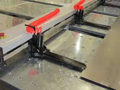 | The sheet material is placed on the feeding table, and the sheet material is held by the pneumatic clamp, and automatically fed and positioned according to the programmed setting value, and coordinated with the movement of the knife holder of the shearing machine, single and continuous automatic cutting is carried out, which greatly improves the cutting accuracy and reduces the labor intensity. Pneumatic long clamp, high working efficiency, small working dead zone; |
